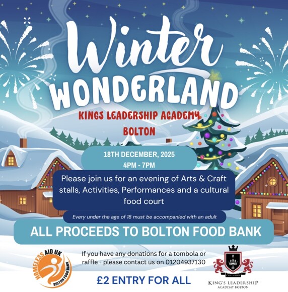 We’re excited to invite you to our Winter Wonderland event on Thursday 18th December 2025, from 4:00pm – 7:00pm here at King’s Leadership Academy Bolton!